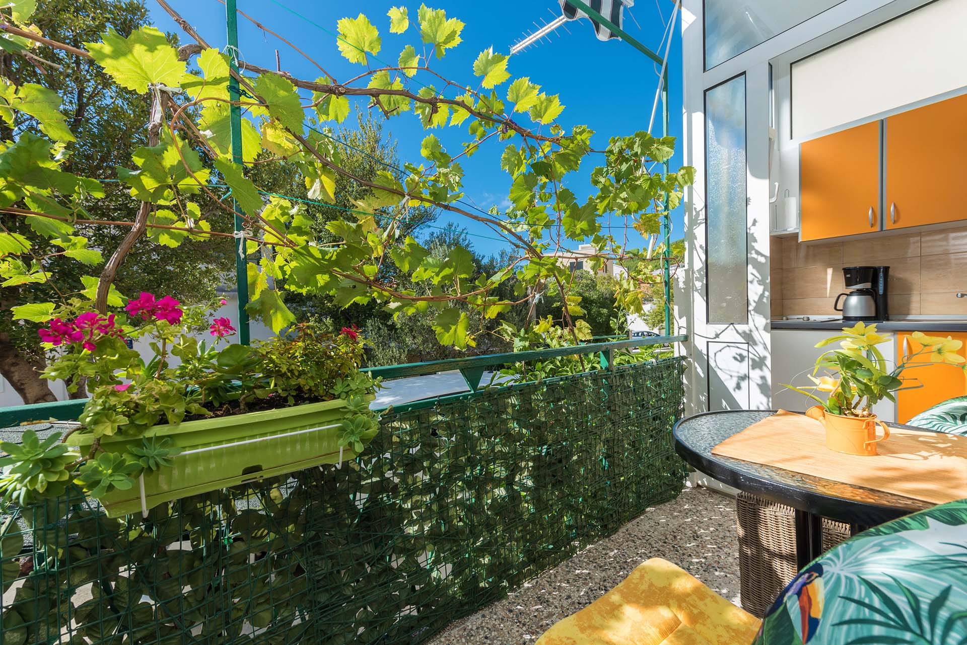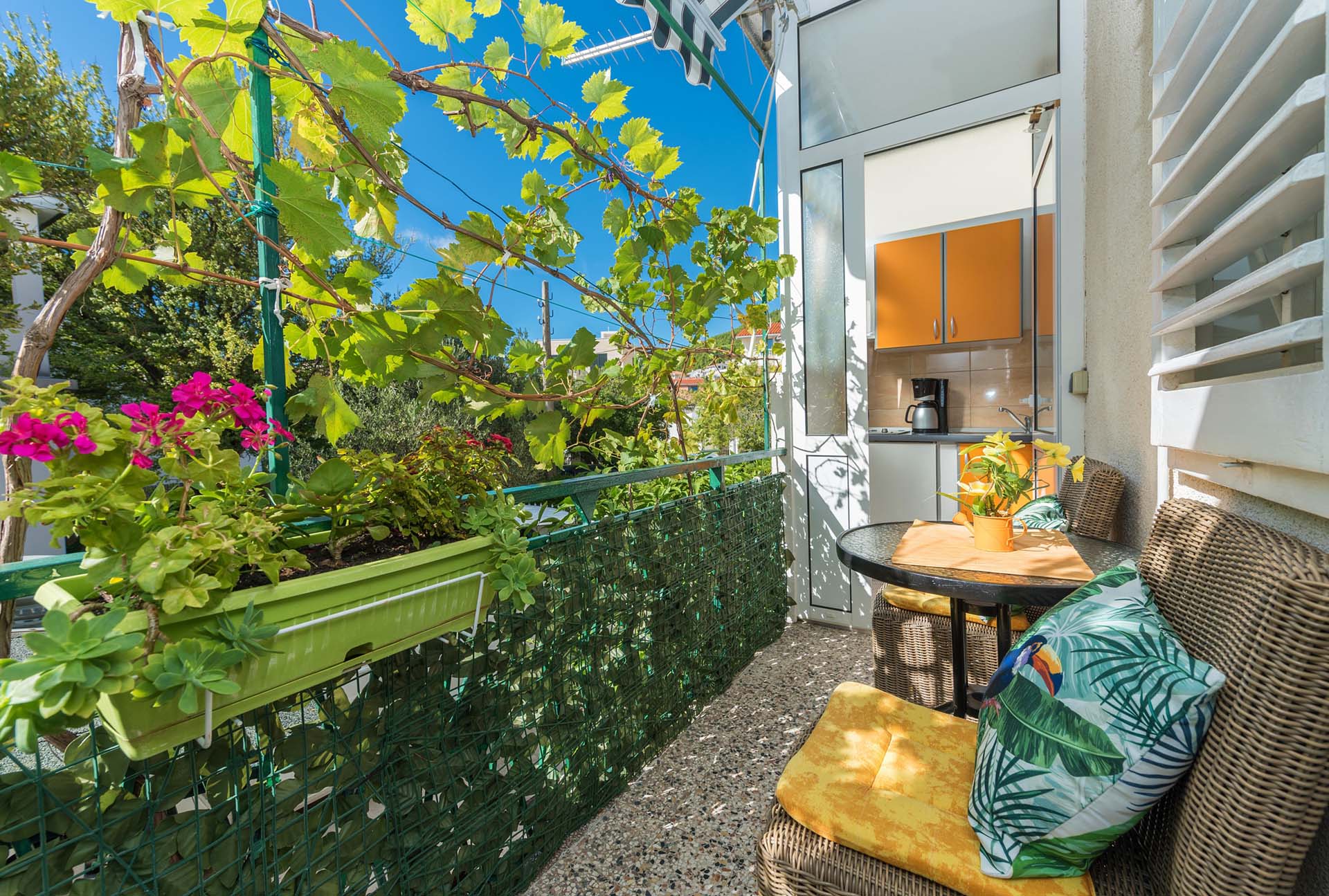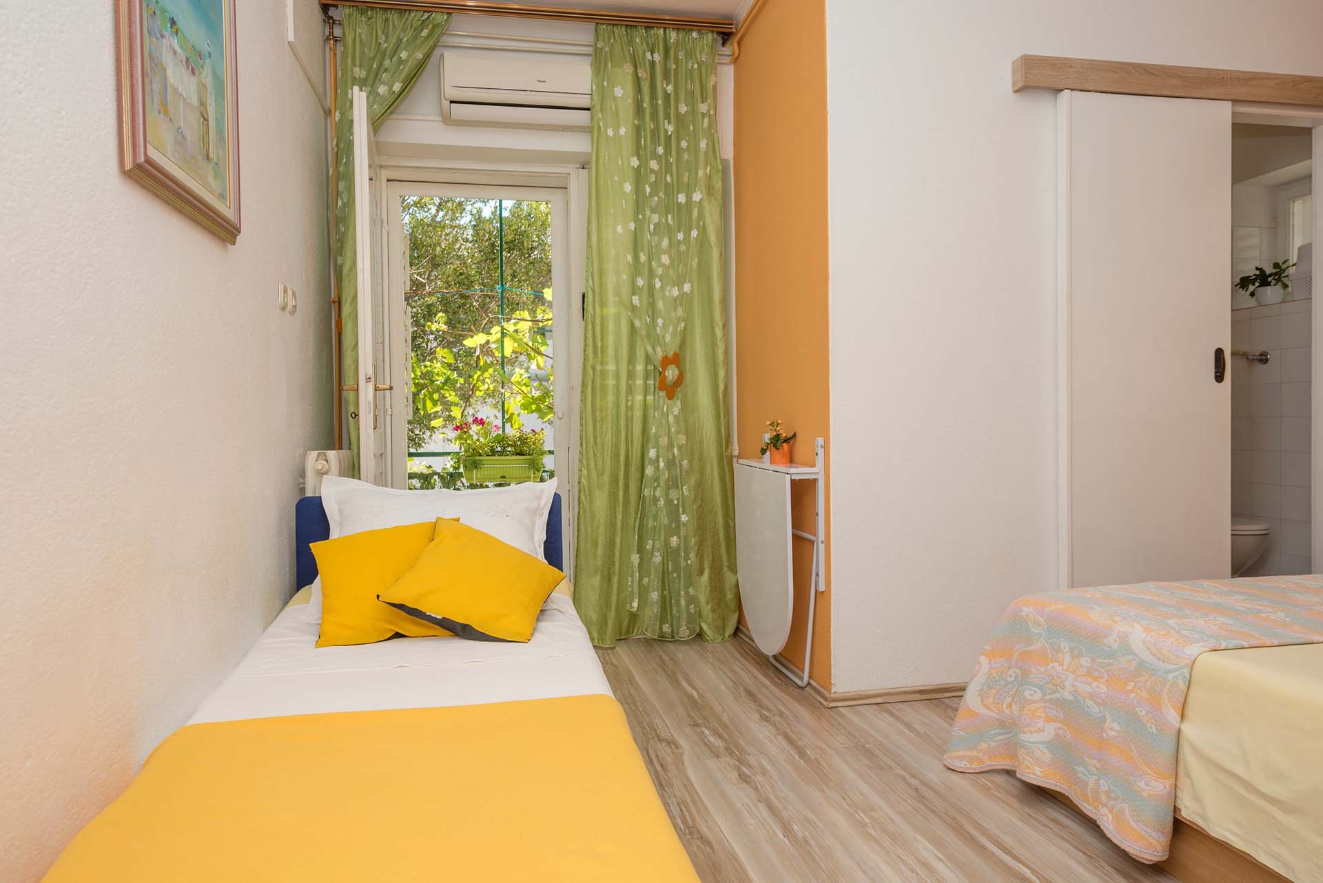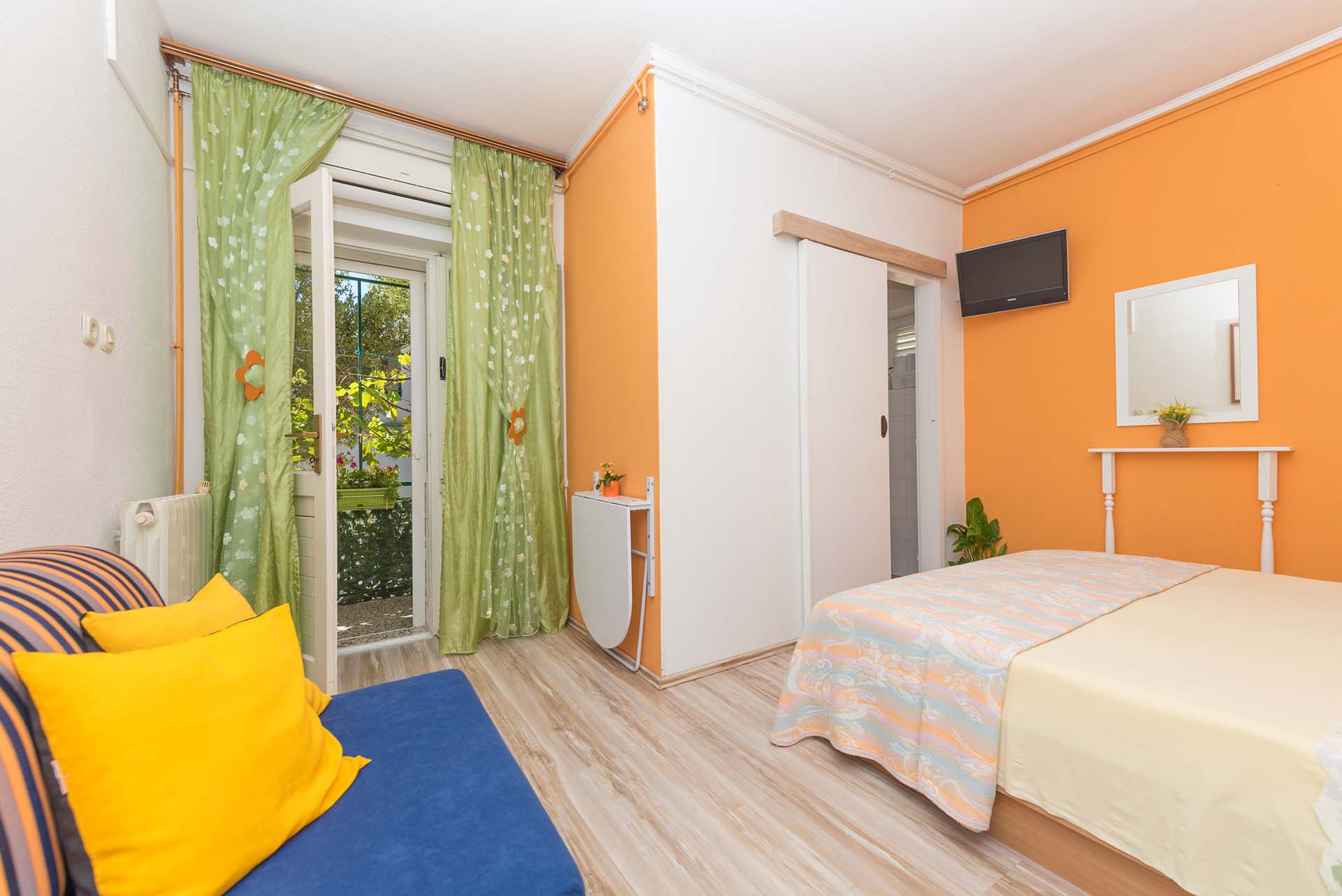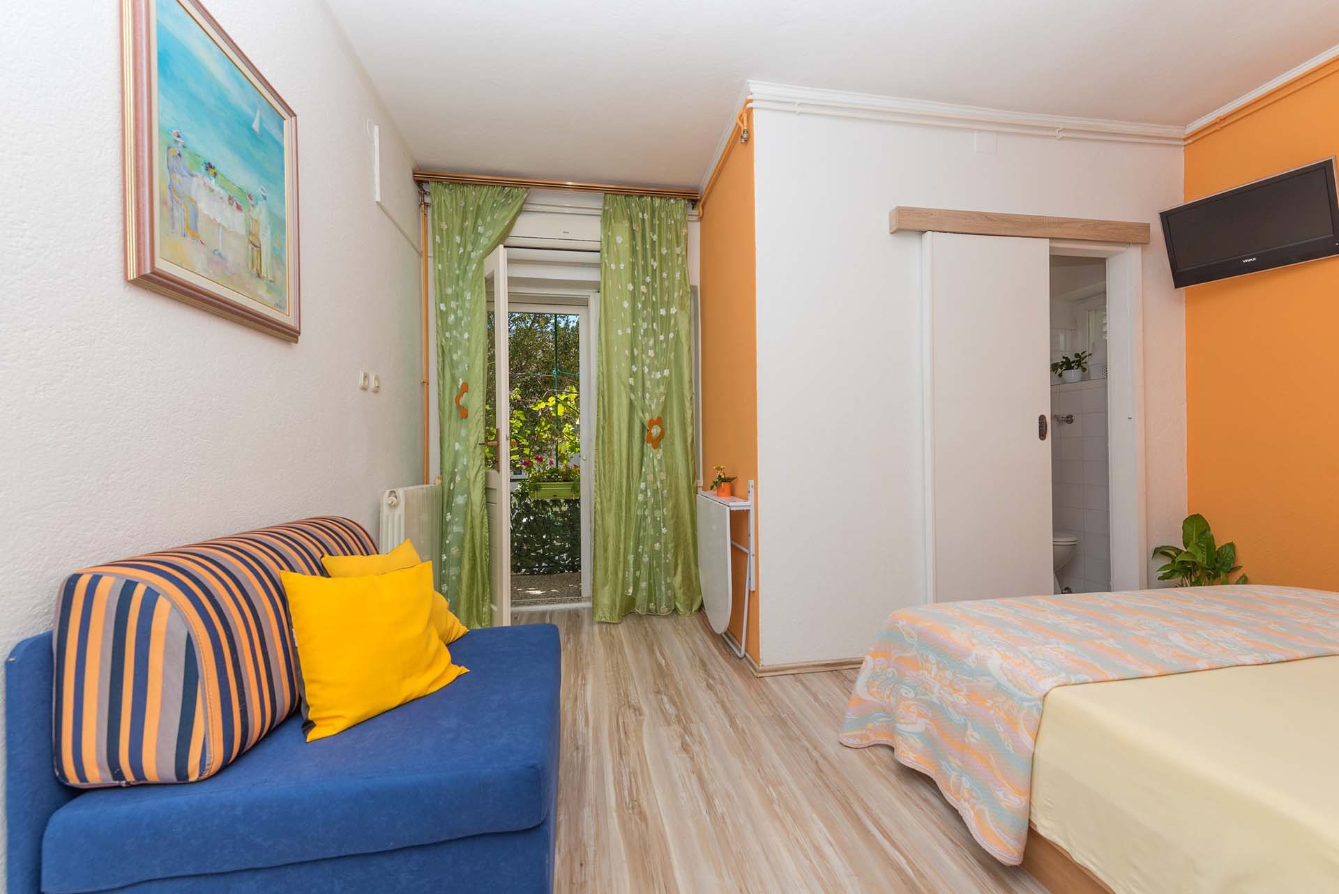 1/3 apartment studio is on raised ground floor, fully equipped: air-conditioning, wi-fi, TV. The apartment is composed of a room with one double bed and one extra bed, mini kitchen, bathroom and a balcony. Private parking ensured.